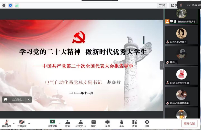 为深入学习宣传贯彻党的二十大精神,切实把广大师生的思想和行动统一到党的二十大精神上来,12月13日晚,电气自动化系党总支副书记赵晓毅以“学习党的二十大精神,做新时代优秀大学生”为题,通过线上向包联班级同学...