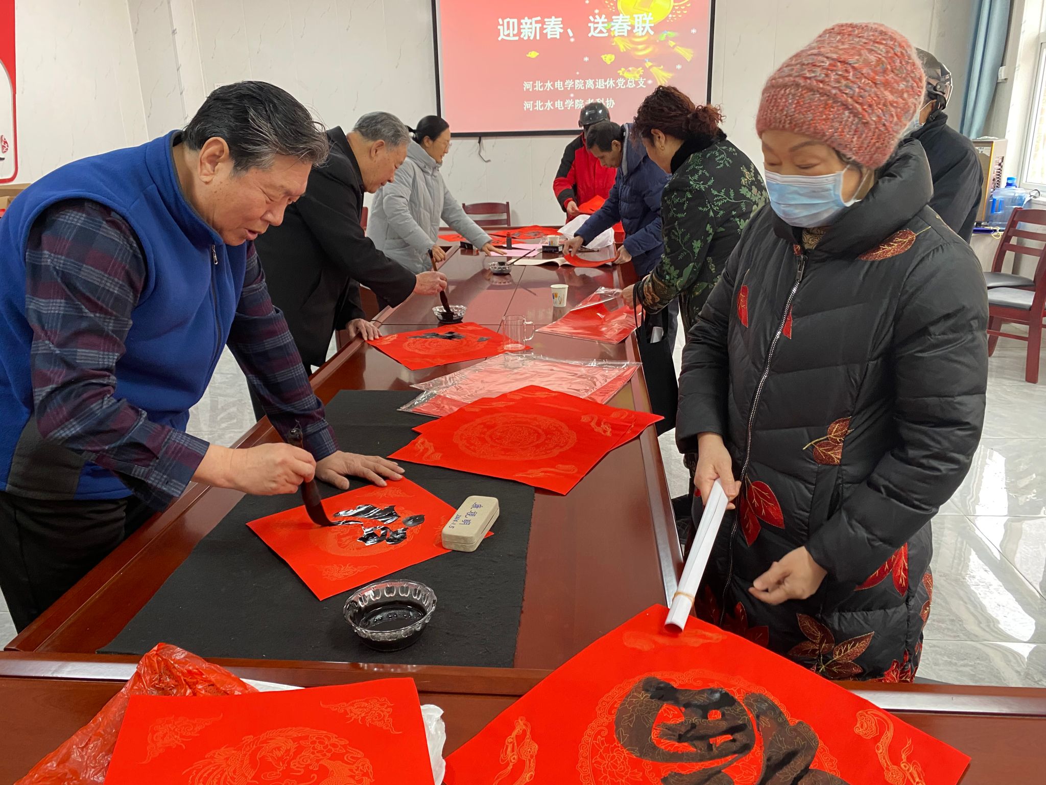 春节即将来临,为弘扬优秀传统文化,营造喜庆祥和的节日氛围,1月16日,我校离退休党总支与老科协在离退休党员活动室联合开展“迎新春 送春联”活动。活动现场,我校老科协常务副会长夏国明、退休老干部刘连德、退休老教师章俊等三位书法家挥毫泼墨、笔走龙蛇,一张张充满年味的“福”字跃然纸上,一幅幅饱含美好祝愿的“春联”烘托出浓浓的节日氛围。离退休党总支书记、老科协秘书长杨凤阁,离退休三支部书记、老科协理事赵兰庚,在现场把一幅幅散发着清新墨香的“...