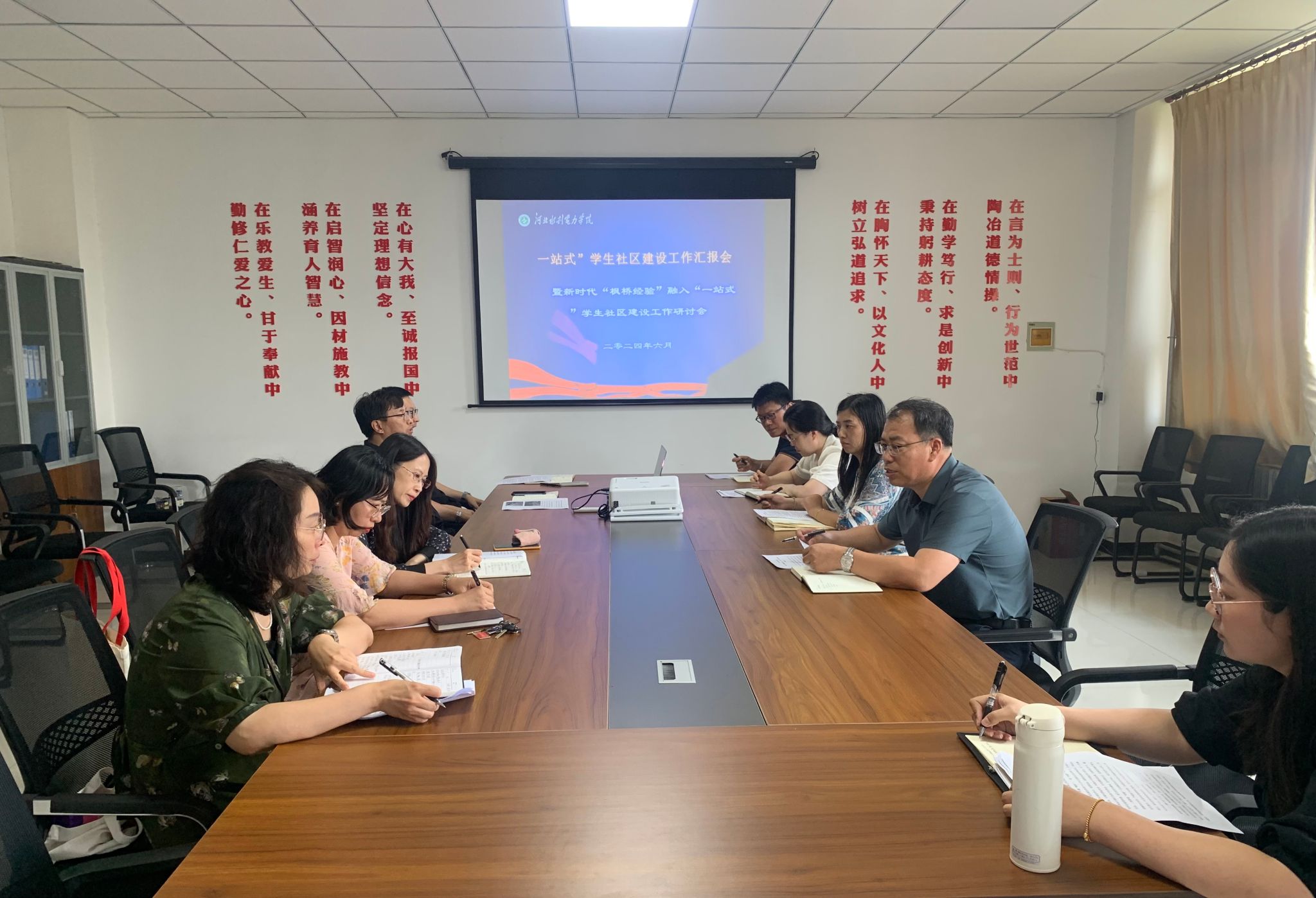 6月27日下午,我校在启智楼B313学工部会议室召开“一站式”学生社区建设工作汇报会暨新时代“枫桥经验”融入“一站式”学生社区建设工作研讨会,学生处、校团委、招生就业处、各系“一站式”学生社区建设工作负责人参加会议,会议由学工部部长、学生处处长郑宝民主持。会上,各职能部门对各自负责功能活动室运行情况进行了汇报,各系就领导力量、管理力量、思政力量、服务力量下沉学生社区及学生社区活动开展情况进行了汇报交流,并就将新时代“...