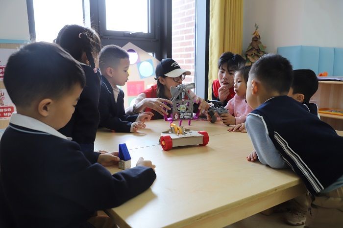 随后,社团成员分为两组进行小班实践活动,小朋友们在“竞创”格斗机器人社团志愿者的指导下,观看、触摸各式各样色彩斑斓的格斗机器人,亲身体验机器人的魅力和风采,玩地不亦乐乎,深刻感受到了来自人工智能科技的神奇力量。在创意分享环节,小朋友们争先恐后地分享自己的创意和想法,表达对机器人的独特见解,在回答问题的同时也加深了对科学知识的记忆,在交流过程中收获了成长。
