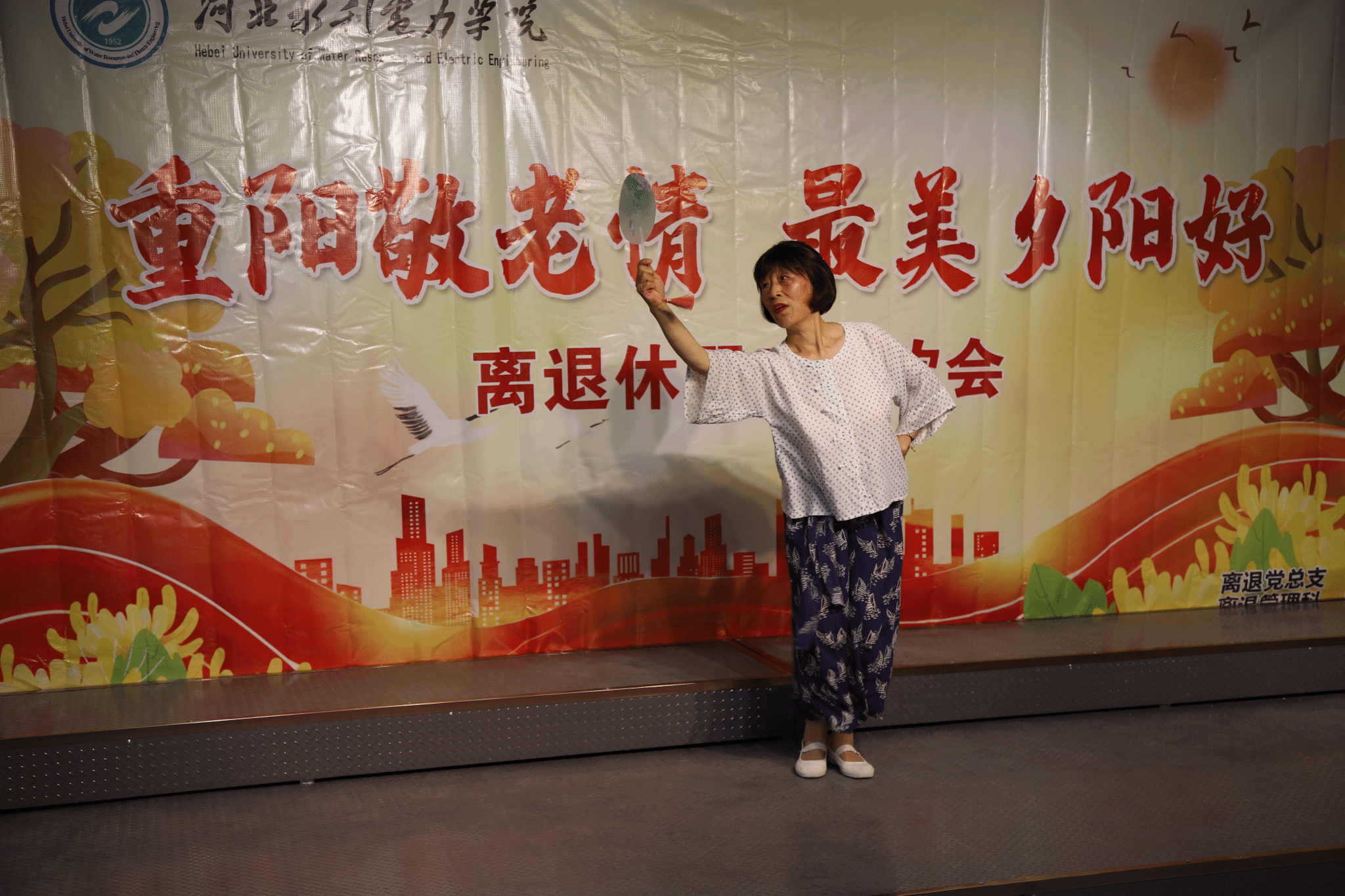 联欢会现场气氛热烈,节目表演精彩纷呈:韩杏改老师带来的朗诵《九九重阳》,声音洪亮,情感饱满,让人们在优美的诗句中感受到了重阳节的浓厚氛围;石国香老师的舞蹈《三月桃花开》更是如春风拂面,轻盈的舞姿仿佛将大家带入了一个桃花盛开的美丽世界;刘国民、赵兰庚、王建平、李志勇四位老师的四重唱《啊,朋友再见》,用歌声诠释友谊与岁月的珍贵,赢得了大家阵阵掌声;最后,大家用三首大合唱《歌唱祖国》《我的祖国》《最美不过夕阳红》抒发对祖国的热爱与祝福、表达对美好生活的向往和对晚年生活的热爱,也为本次联欢会画上圆满的句号。
