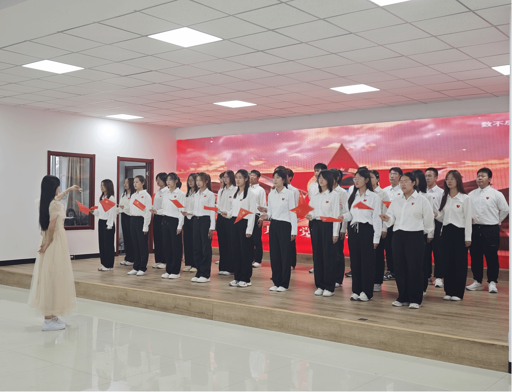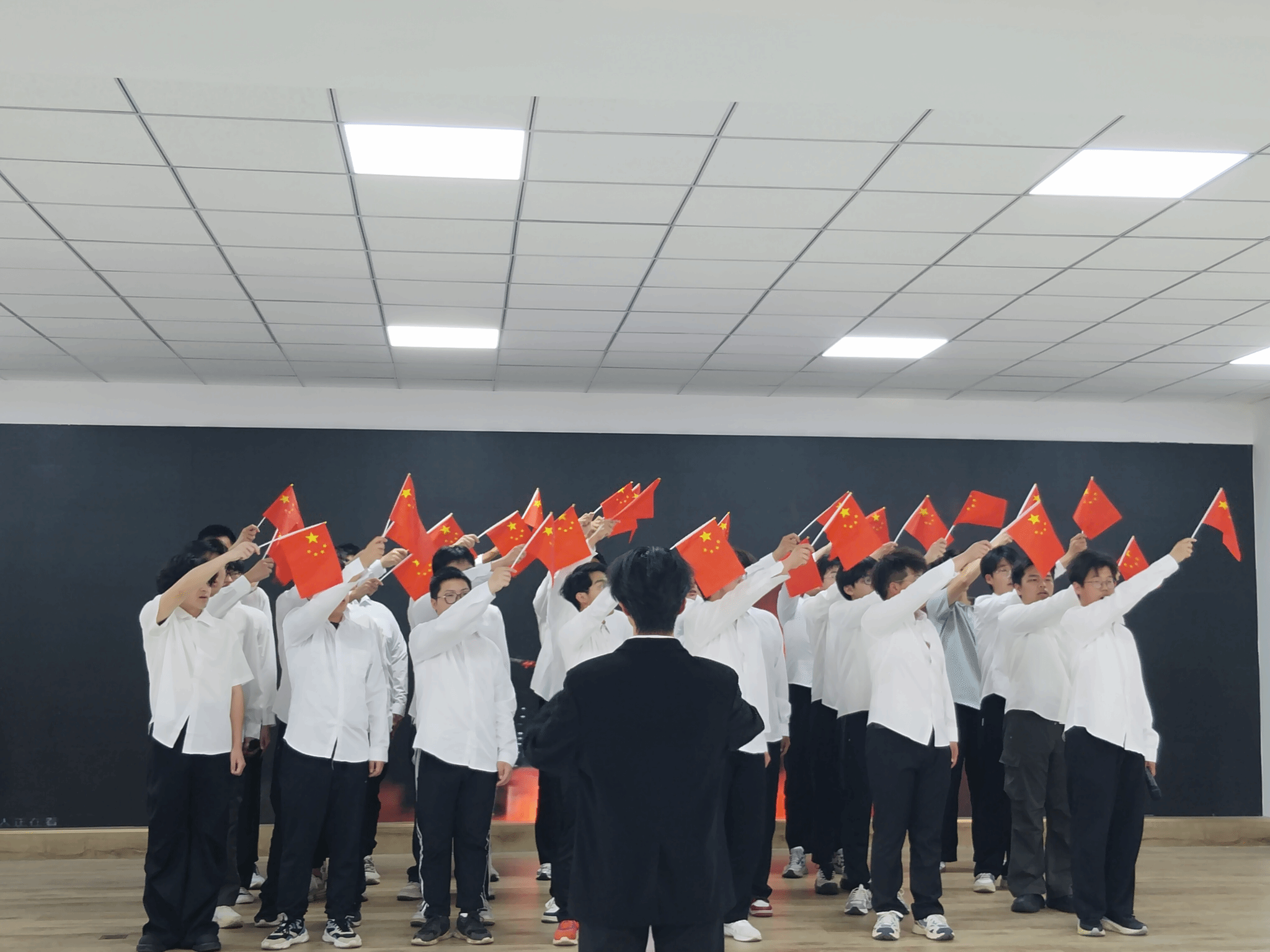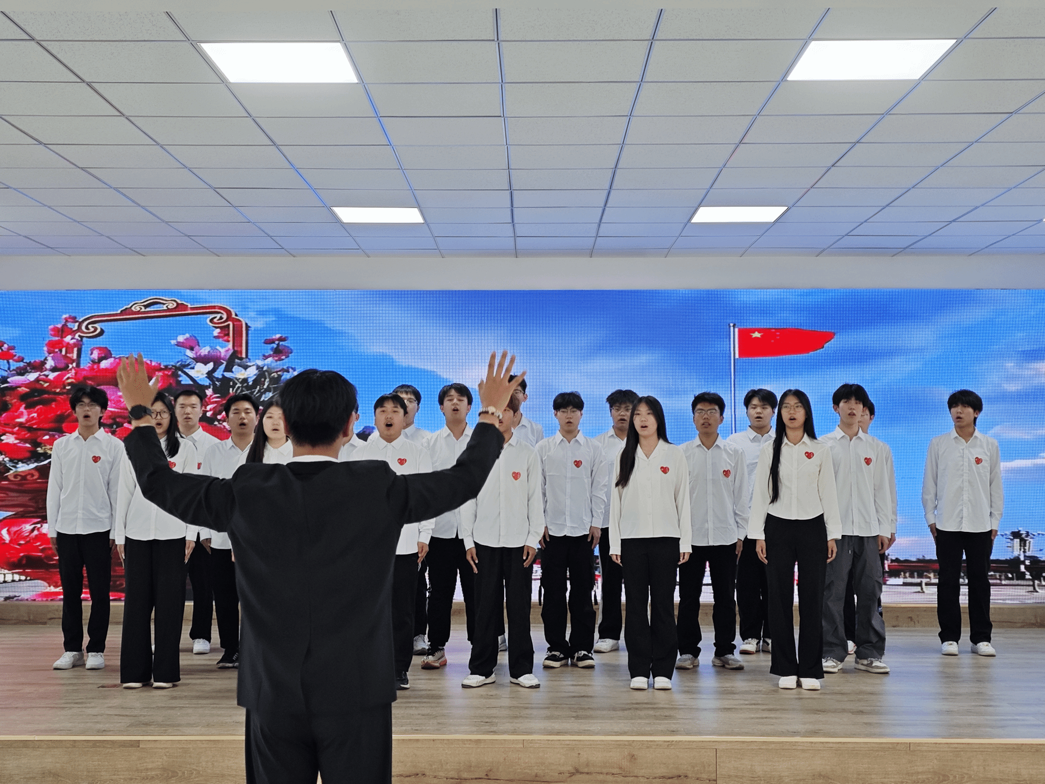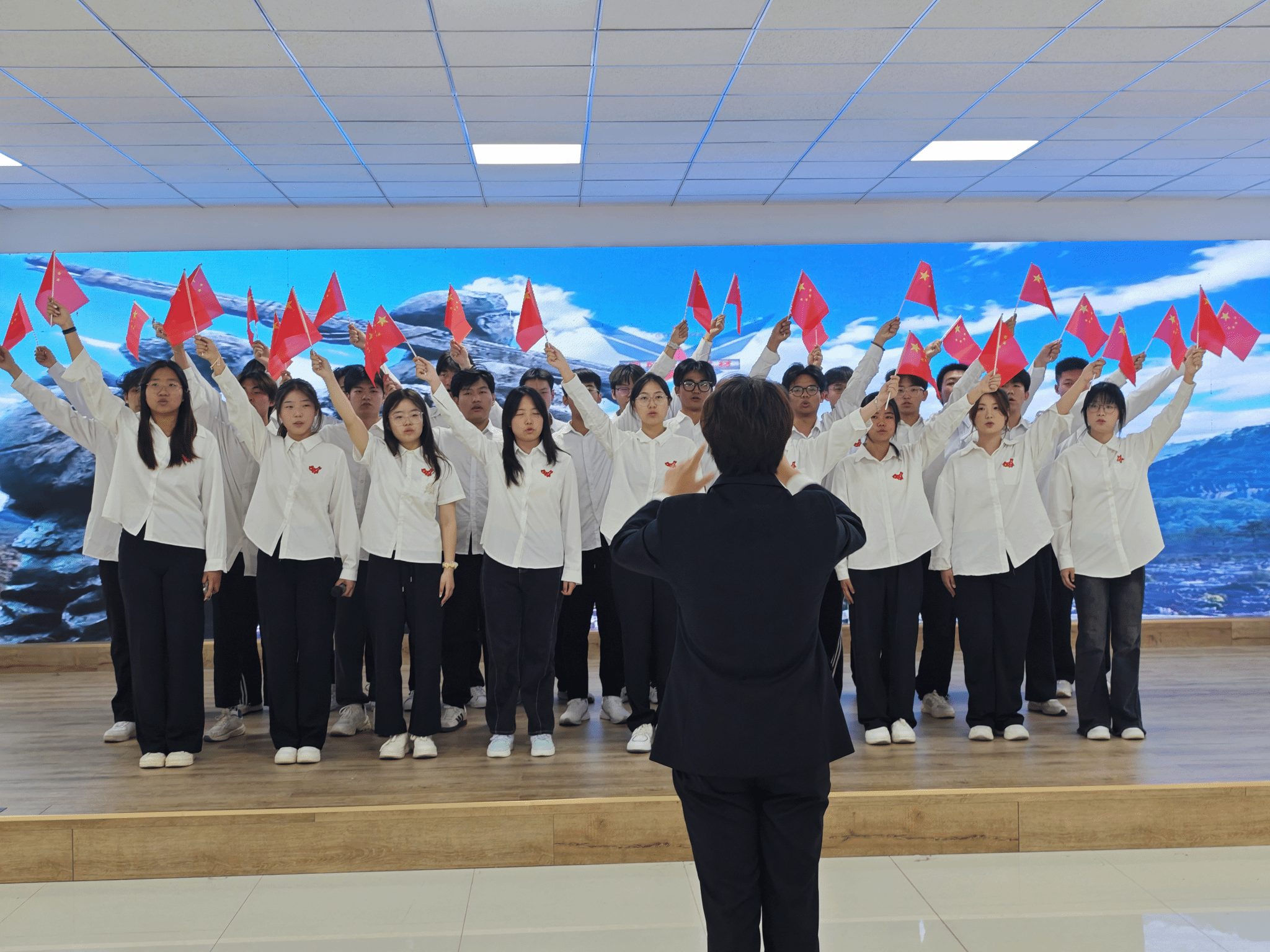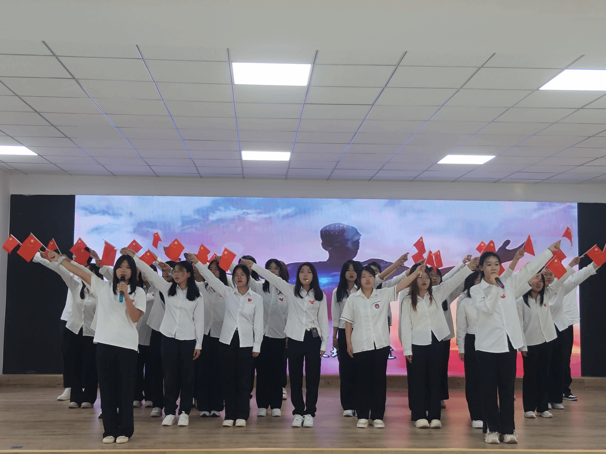 “五星红旗迎风飘扬,胜利歌声多么响亮”,《歌唱祖国》的悠扬旋律让现场气氛愈发热烈。全体师生挥动手中的小红旗,与台上的演唱者一同歌唱,共同抒发对祖国的热爱与赞美。这首歌见证了新中国从站起来、富起来到强起来的伟大飞跃,此刻,它凝聚起了师生们的爱国热情,让大家更加坚定了为祖国繁荣富强而努力奋斗的决心。