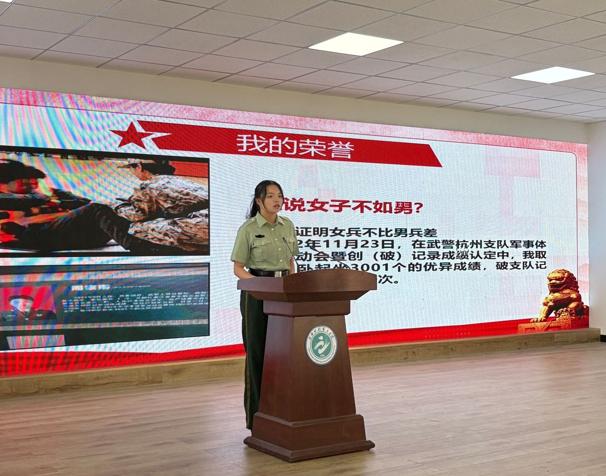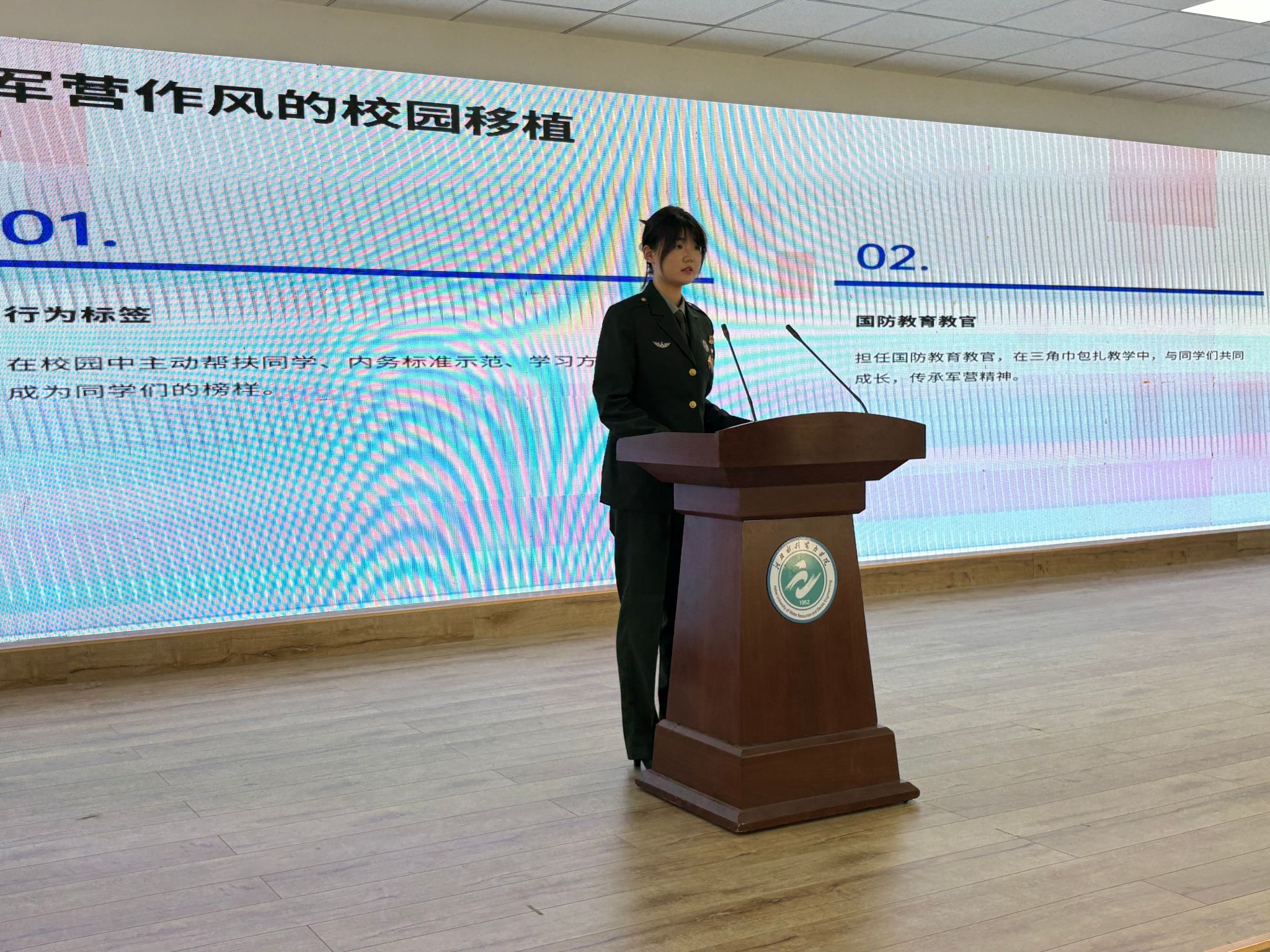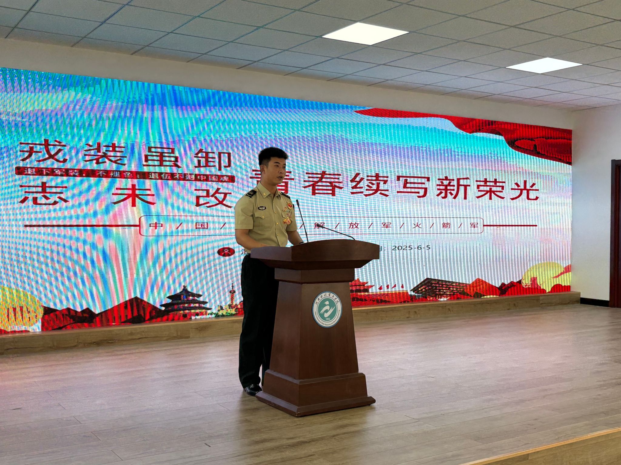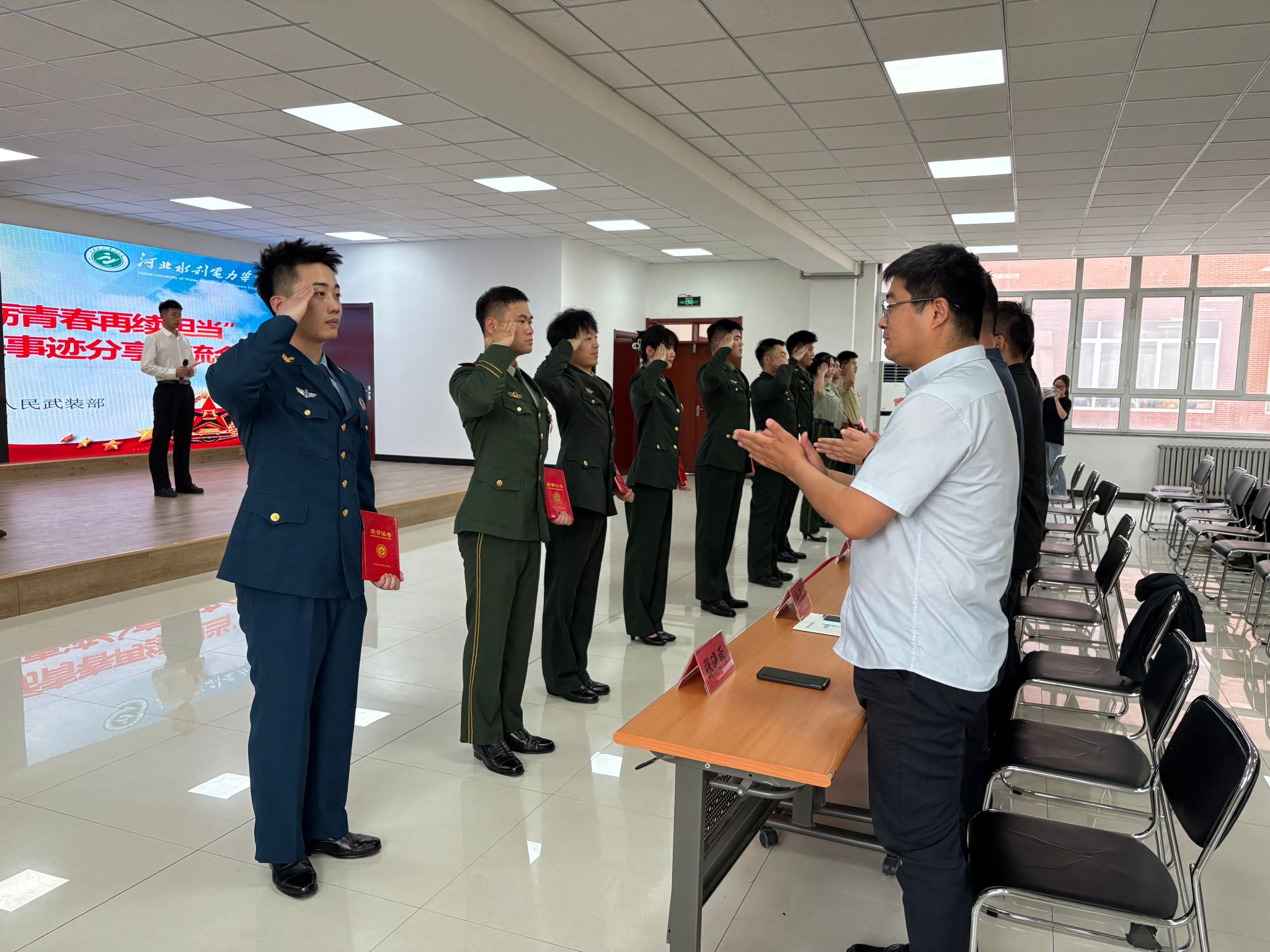 活动现场,10名退役大学生代表结合自身经历,以真挚的情感和生动的语言分享了他们的军旅故事,讲述了从校园到军营的蜕变历程。水利工程系水电2301班崔新鹏,用火箭军的硬核经历告诉我们:挑战自我方能突破极限,军人的坚韧永远是青春最亮的底色;电力工程系电气2302班周家琳,从军事训练的“巾帼不让须眉”到校园里的“先锋榜样”,她用行动证明:舞台会变,但奋斗的姿态永远耀眼;经济贸易系财管2401班田茜婷,从“普通女孩”到“医疗救护员”,她的蜕变让我们相信:青春因磨砺而出彩,人生因奋斗而升华。